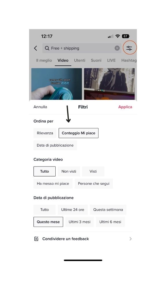 Filtra per “Video” → “Conteggio Mi piace”