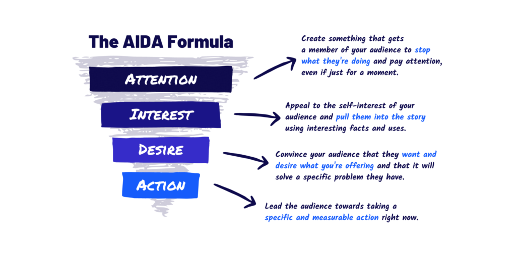 Forse il framework più conosciuto della lista, porta il prospect attraverso diverse fasi di consapevolezza durante la lettura o la fruizione del contenuto. Aggancia la sua attenzione, la mantiene suscitando interesse, lo trasforma in desiderio e converte con una CTA forte.