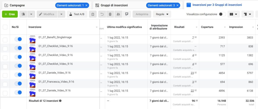Questa è una campagna dove ho impostato 3 adset e 4 creatività per ognuno. Per scoprire qual è la migliore potrei entrare in ogni adset e guardarmele una per una.